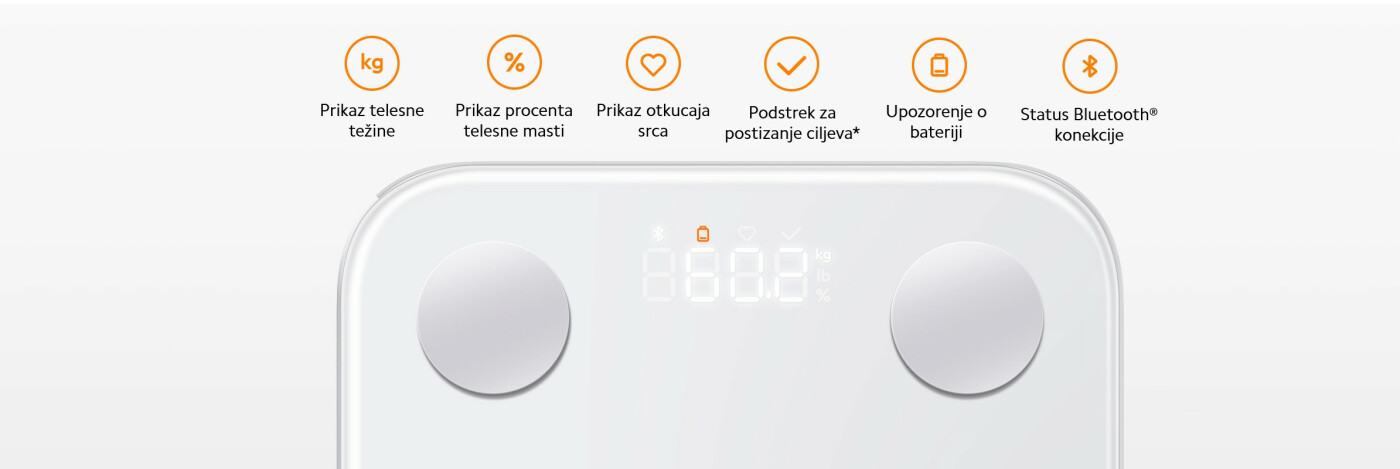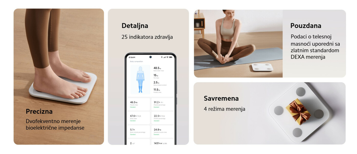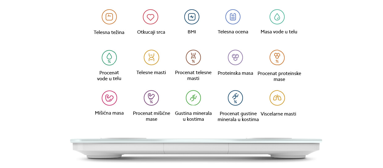 *Izveštaj o analizi 25 indikatora telesne kompozicije: telesna težina, broj otkucaja srca, BMI, telesna ocena, sadržaj vode u telu, hidratacija vode u telu, telesne masti, procenat telesne masti, masa proteina, procenat proteinske mase, mišićna masa, procenat mišićne mase, gustina minerala u kostima, procenat gustine minerala u kostima, procenat visceralne masti, bazalni metabolizam, čista telesna masa, tip tela, procenjeni odnos struka i kukova, starost tela, masa skeletnih mišića, kontrola težine, kontrola mišića, kontrola masti, standardna težina. Povežite se na aplikaciju Mi Home/Xiaomi Home da biste videli kompletan izveštaj o sastavu tela.
