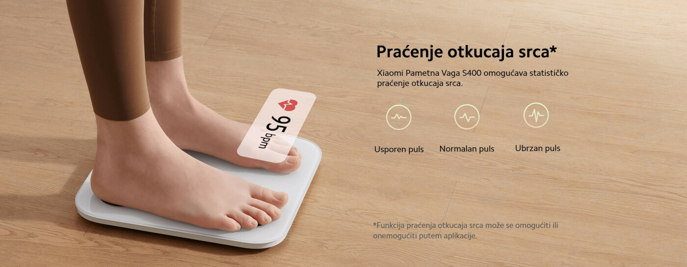 *Statičko praćenje otkucaja srca: Ovo se odnosi na broj otkucaja srca u minuti izmeren dok je korisnik u mirnom i nepomičnom stanju. Xiaomi Pametna Vaga S400 može meriti statički otkucaj srca nakon merenja telesne masti. Praćenje otkucaja srca je podrazumevano uključeno i može se isključiti u aplikaciji Mi Home/Xiaomi Home > Uređaj > Podešavanja.