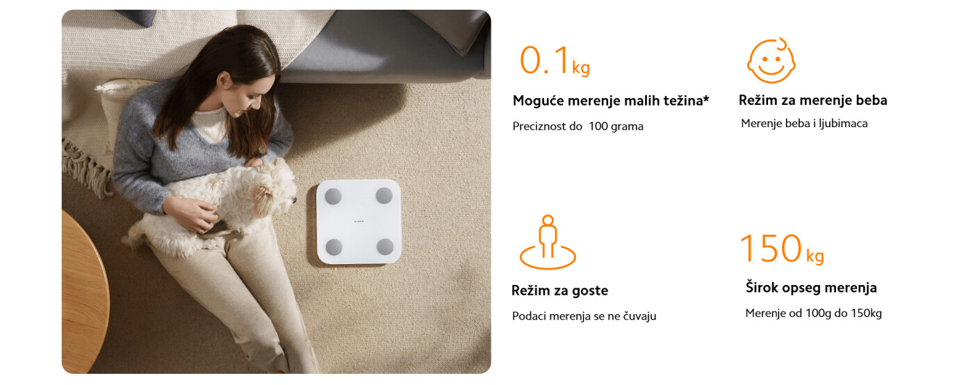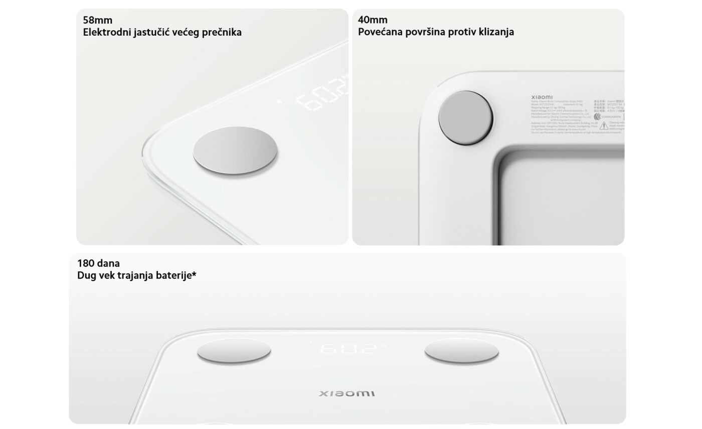 *Koeficijent korelacije ≥0,93 između Xiaomi Pametne Vage S400 i DEXA za podatke merenja masne mase: Podaci potiču iz izveštaja o ispitivanju tačnosti Xiaomi Pametne Vage S400 na osnovu dual-energetske rendgenske apsorpciometrije (DEXA) koju je dao dr. Meitao i njegov istraživački tim na Kineskom institutu za sport i zdravstvene nauke, Pekinški sportski univerzitet. Izveštaj o ispitivanju broj: BSU20220389.